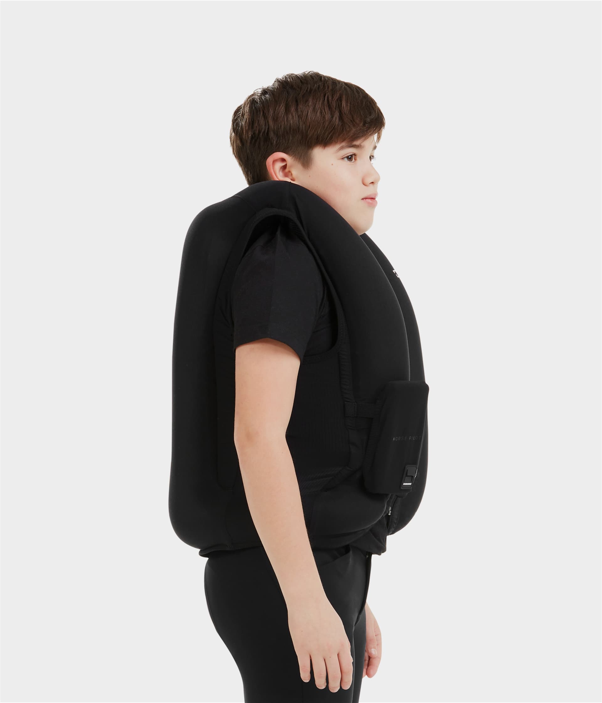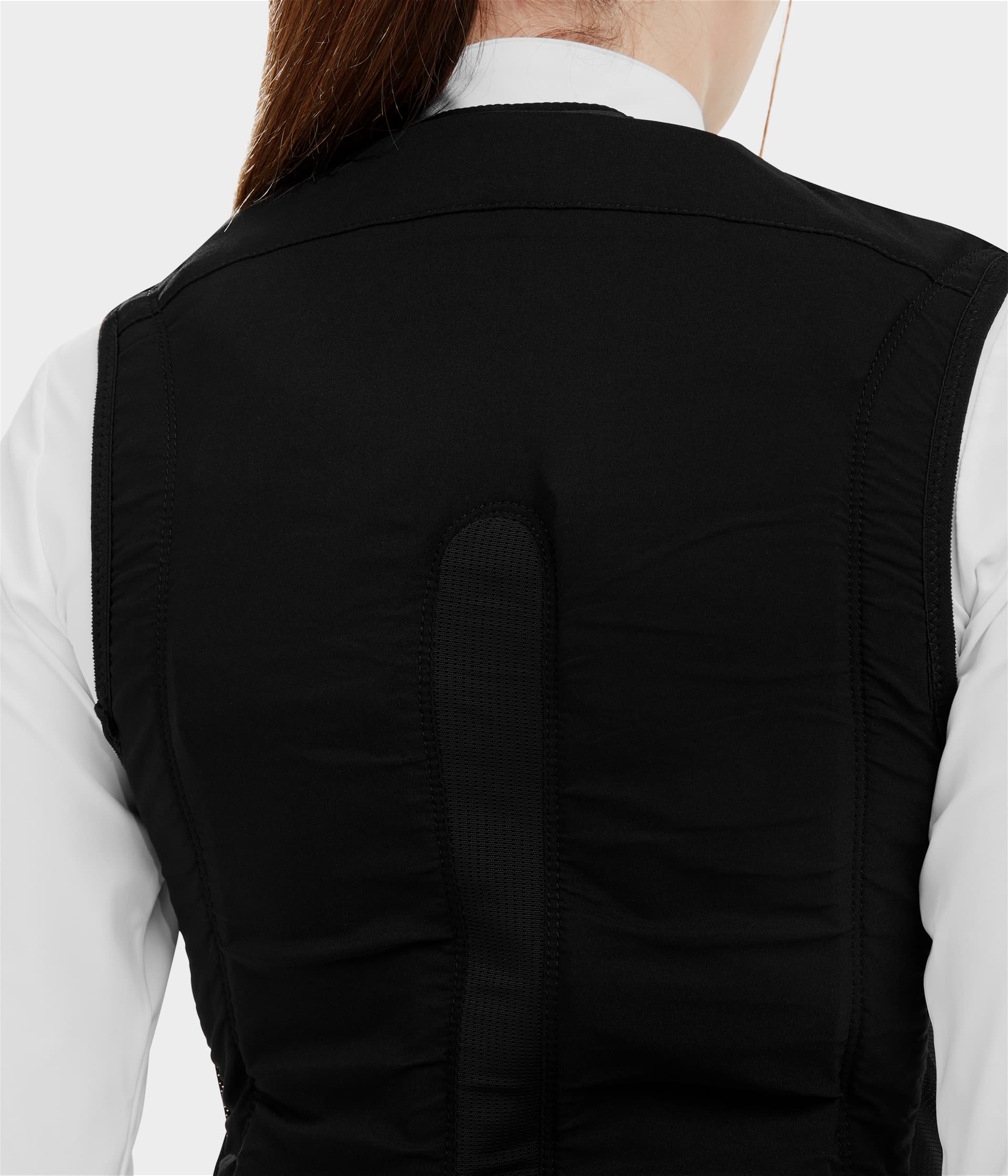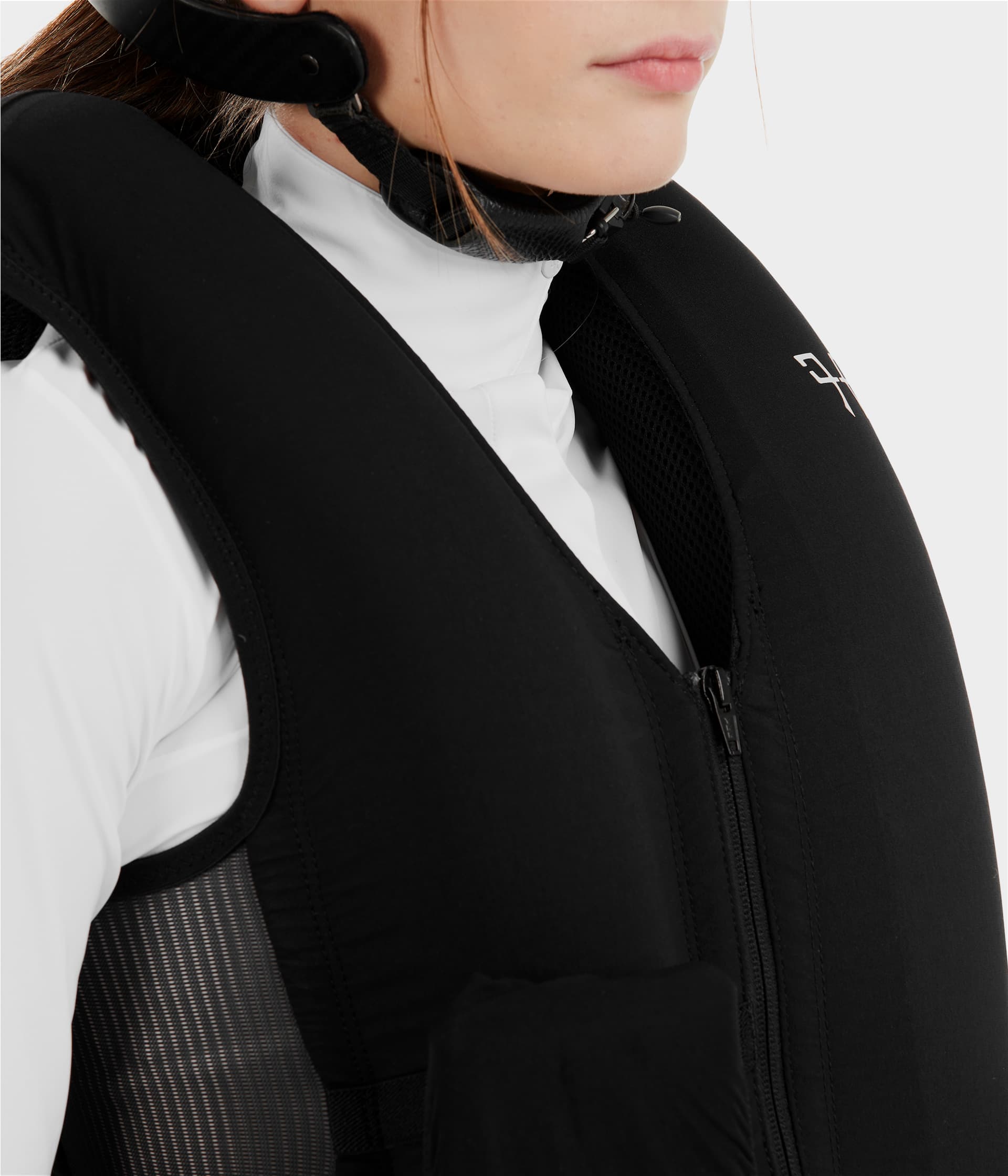 Die ergonomische Form und das Bi-Stretch-Material der Weste sorgen dafür, dass sie das Aufblasen des Airbags aushält und dabei leicht bleibt. Das an den Rippen und am Rücken positionierte Meshgewebe bietet Reitenden die Atmungsaktivität, die sie bei intensiver Anstrengung benötigen. Das Kabel, das den Reiter mit seinem Sattel verbindet, ist magnetisch: Es lässt sich mit einer Hand verbinden und trennen, sodass die Zügel nicht losgelassen werden müssen.