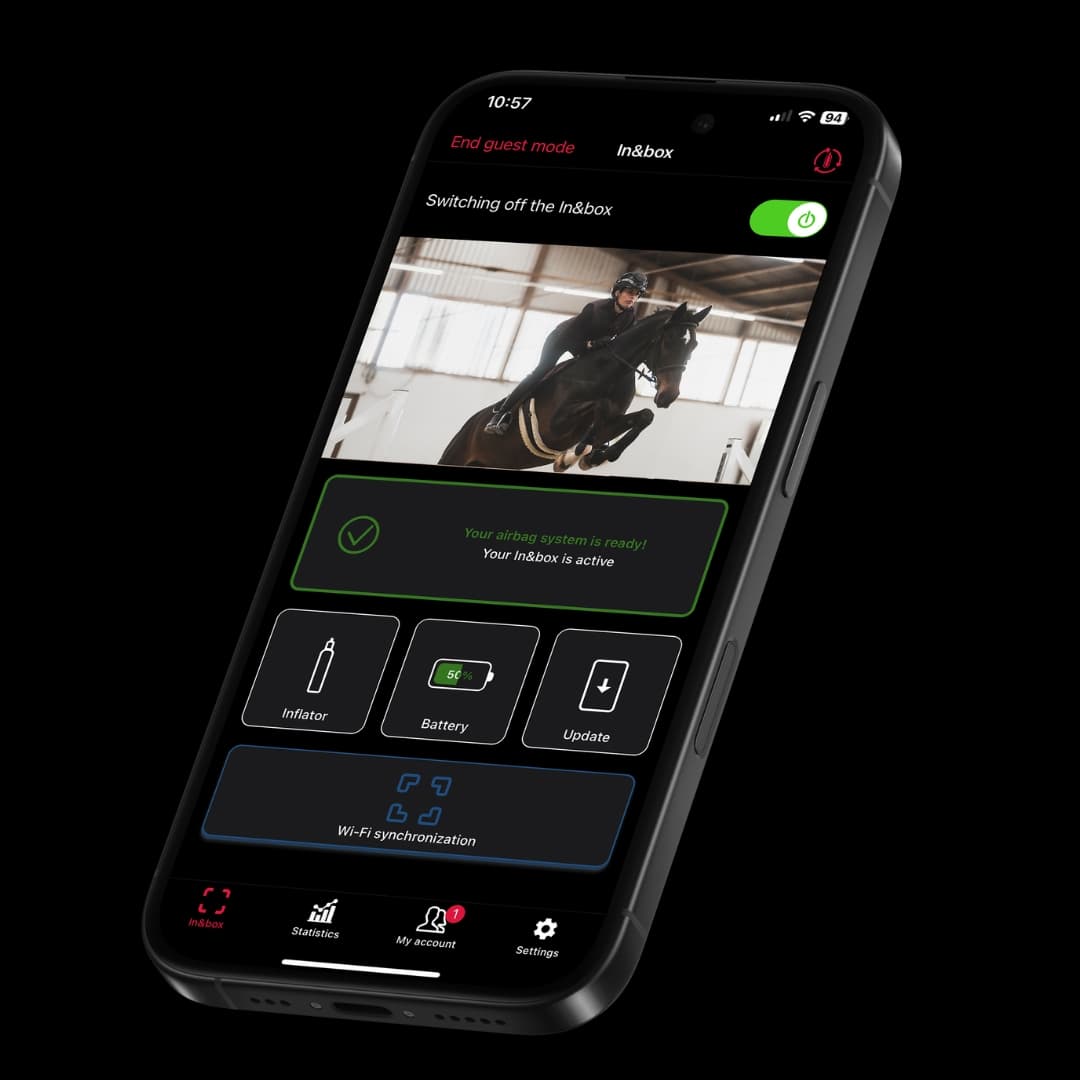 The " My In&Box " mobile application is the real-time dashboard for your equestrian airbag system. Connected via Bluetooth to the In&Box technology, the application allows you to activate your airbag remotely and provides key information: In&Box battery level, activated mode, necessary updates. With this application, you have total control over your equipment, guaranteeing personalised, adaptive safety every time you ride.
