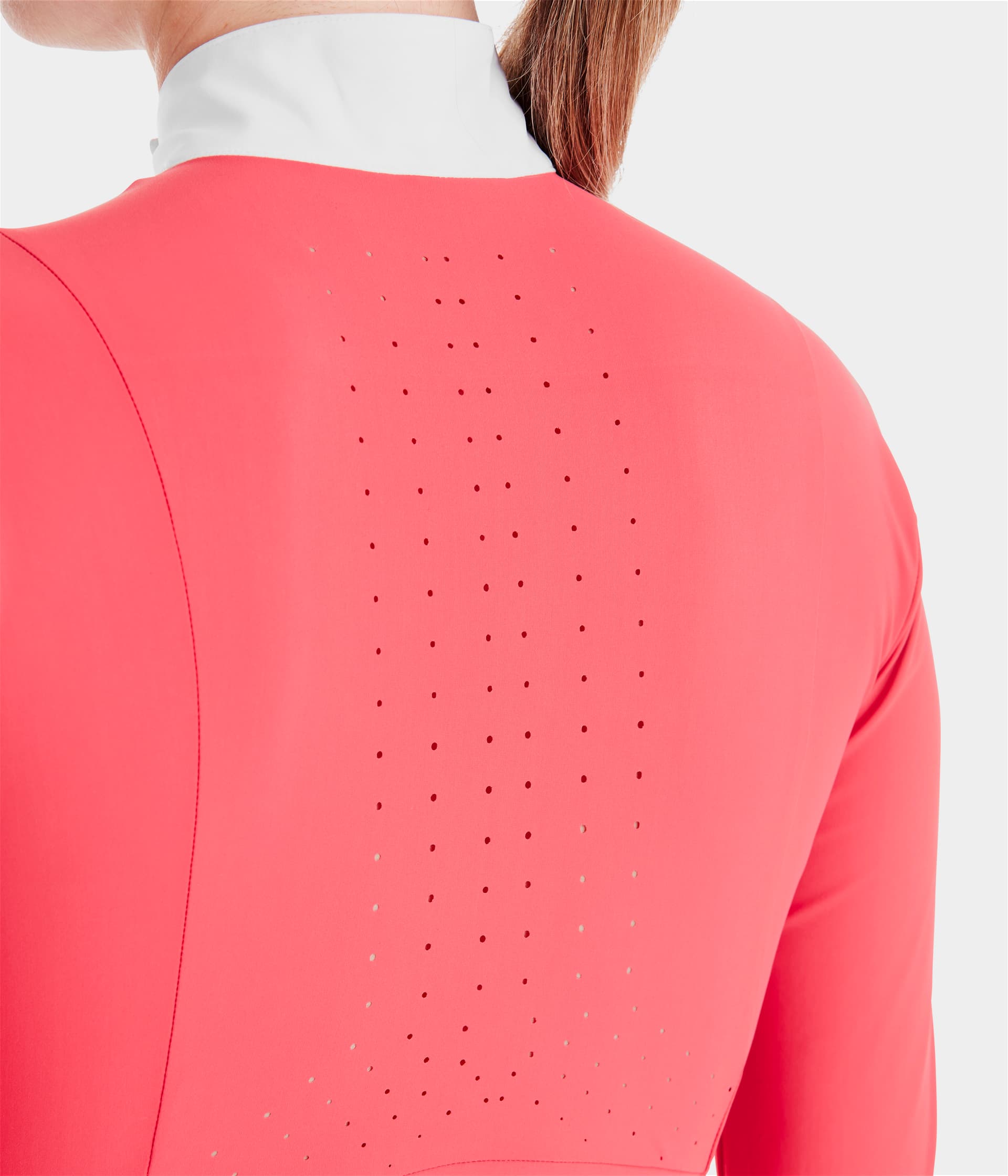 We have created a brand-new design to bring even more comfort. With its ergonomic cut-outs, this shirt adapts perfectly to the body's movements. The shape of the wrist and collar has been specially developed to free up the rider's movements. Made of a 4-way stretch fabric and equipped with our UV-Block technology, the shirt offers optimum comfort and protection. The micro-perforated area in the back is highly breathable and efficiently dissipates heat during intense efforts. Its high collar is suitable for hunter classes.