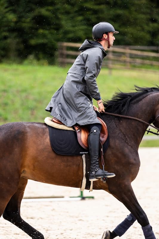 The surface of the material is fully coated, making it highly waterproof and windproof. The structure is supple and stretchy for total freedom of movement when riding. All the seams are waterproofed and the zippers are covered with a protective flap to limit water infiltration, making the jacket even more waterproof. A large opening in the back lets you adjust the shape while riding. The sides of the jacket are fastened around the thighs with elastic straps for added protection. The eco-friendly fabric is OEKO-TEX® Standard 100 certified, and the DWR C0 water-repellent treatment is PFC (fluorocarbon) free.