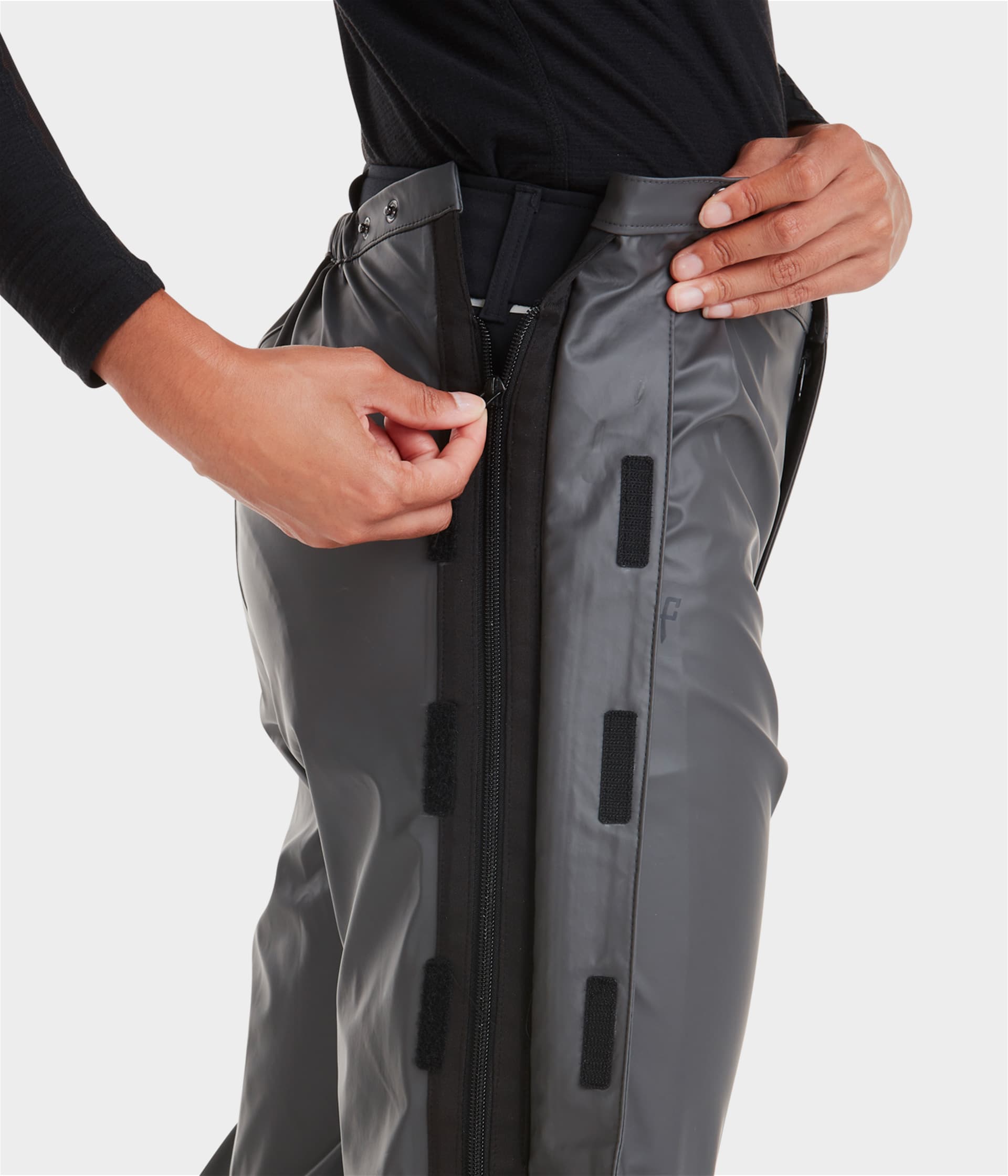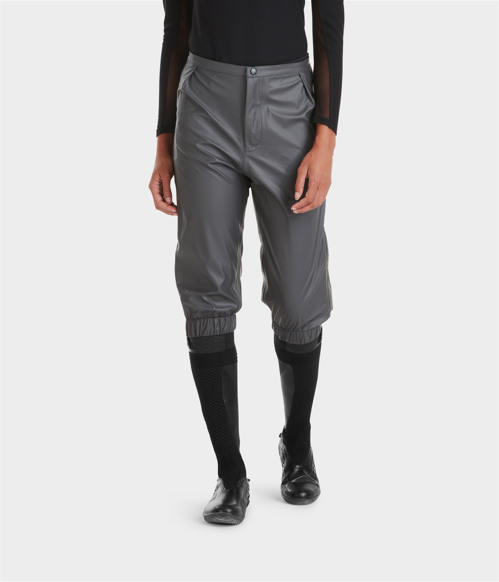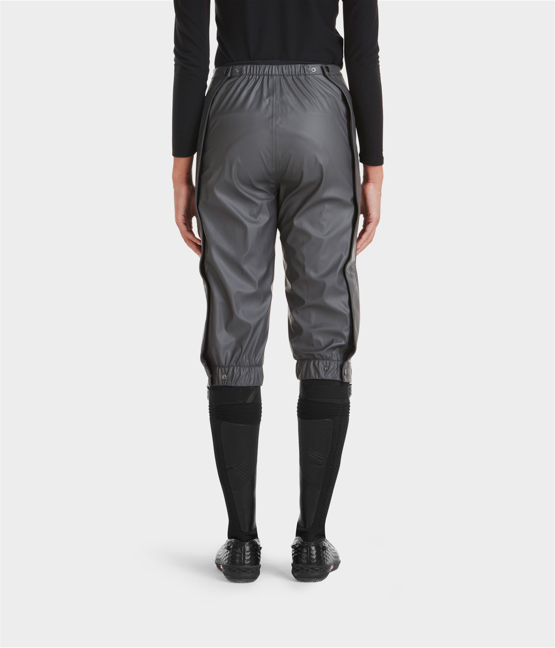 La surface de la matière a été intégralement enduite, lui donnant des propriétés d’imperméabilité et de coupe-vent élevées. Sa structure est souple et stretch pour une liberté de mouvement totale quand vous êtes à cheval. Toutes les coutures sont étanchées et les zips sont recouverts d’un rabat protecteur pour limiter les infiltrations d’eau, et renforcer la protection imperméable du pantalon. Pensé pour être porté par-dessus votre pantalon d’équitation : le volume est regular, la taille et les bas de jambe sont élastiqués et réglables, deux grands zips sur les côtés permettent un enfilage simple et rapide. Éco-responsable, la matière est certifiée OEKO-TEX® Standard 100, et le traitement déperlant DWR C0 est sans PFC (fluorocarbures).
