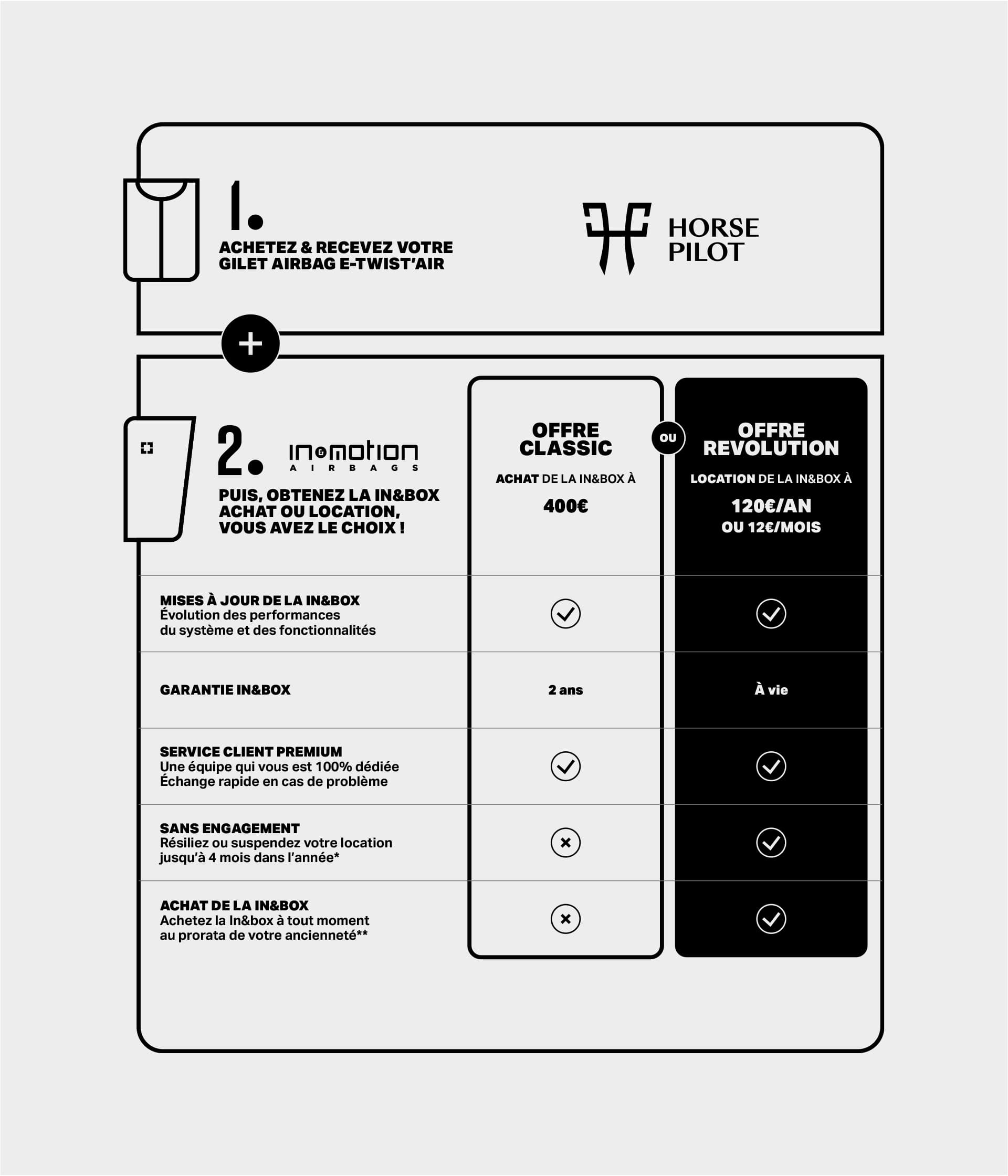 L'Airbag E-Twist’Air incarne une véritable avancée technologique dans la protection des cavaliers. Au cœur du dispositif, la technologie In&box est équipée d'un capteur 6 axes (accélération et rotation) qui analyse en temps réel les mouvements du cavalier à raison de 1 000 mesures par seconde. Ce système prédictif anticipe les chutes, même les plus complexes, comme celles avec le cheval où le cavalier reste lié à sa monture. (Rendez-vous sur shop.inemotion.com pour activer votre abonnement my In&box.)
