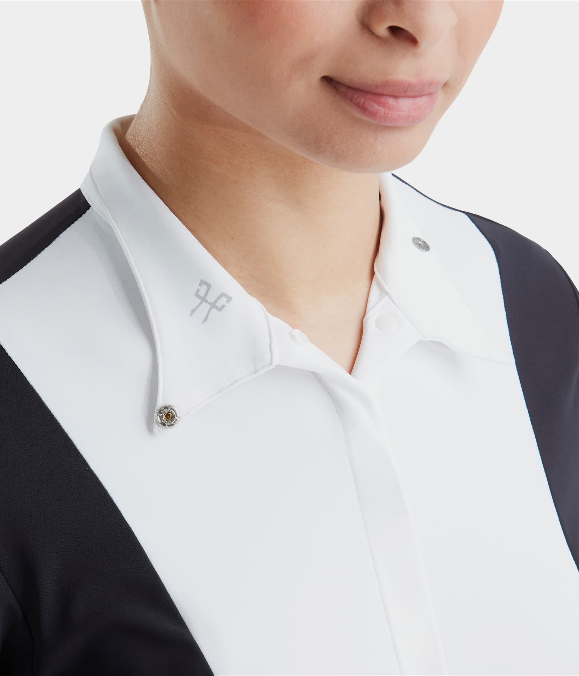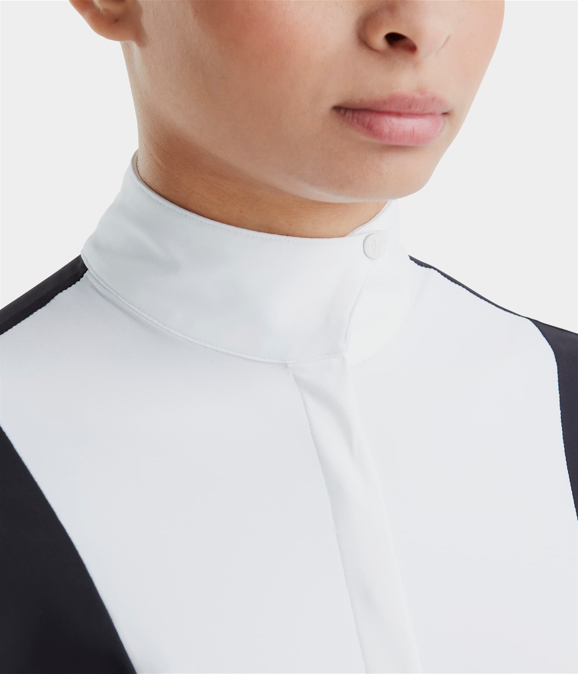 We have created a brand-new design to bring even more comfort. With its ergonomic cut-outs, this shirt adapts perfectly to the body's movements. The shape of the wrist and collar has been specially developed to free up the rider's movements. Made of a 4-way stretch fabric and equipped with our UV-Block technology, the shirt offers optimum comfort and protection. The micro-perforated area in the back is highly breathable and efficiently dissipates heat during intense efforts. Its high collar is suitable for hunter classes.