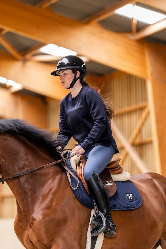 When riding, it is important to find technical clothing that adapts to both the body shape and the posture of the athlete during exercise. However, equipment for riders must take into account the different positions of walk, trot and canter to offer the best performance to athletes. The technology Perform Fit from Horse Pilot helps to assist all the athlete's movements in any conditions and without any tension or blockage. In our design workshops, we aim to offer flexible and ergonomic clothing to promote balance. The ergonomic cut-outs of our sweatshirts protect the kidneys unlike other technical clothing. The sleeves are preformed for even more aerodynamics.