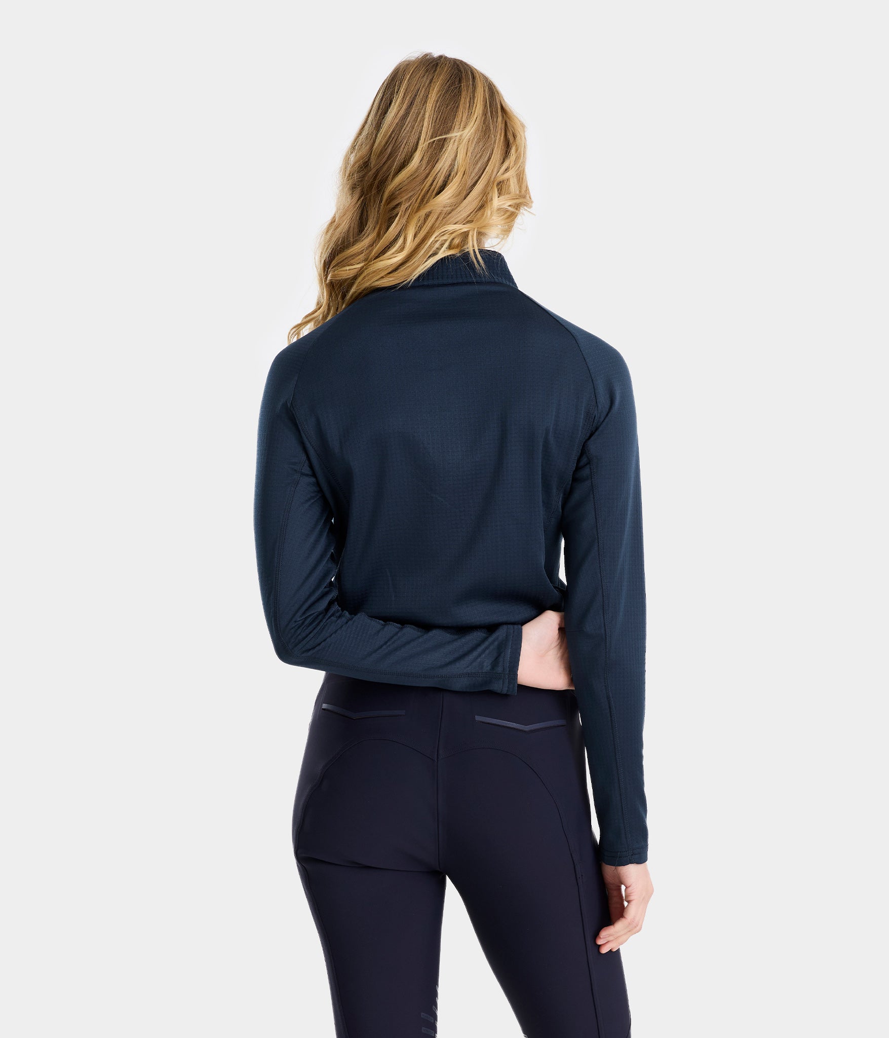 We have designed the Winter Shirt in a fleece fabric that is stretchy, lightweight, warm and breathable. Featuring our ThermoregulationHP technology, the fabric maintains an ideal body temperature. The fibres effectively absorb moisture from the body and dry quickly to keep you dry. The inner surface is brushed for warmth and has a grid structure to increase breathability during more intense efforts. This knitting technique ensures a good balance between warmth and breathability. The fit is tailored with ergonomic cuts for optimal ease of movement. There are no seams at the shoulders for better mobility and to avoid hindering your movements on horseback. A technical sports T-shirt designed for winter activities.