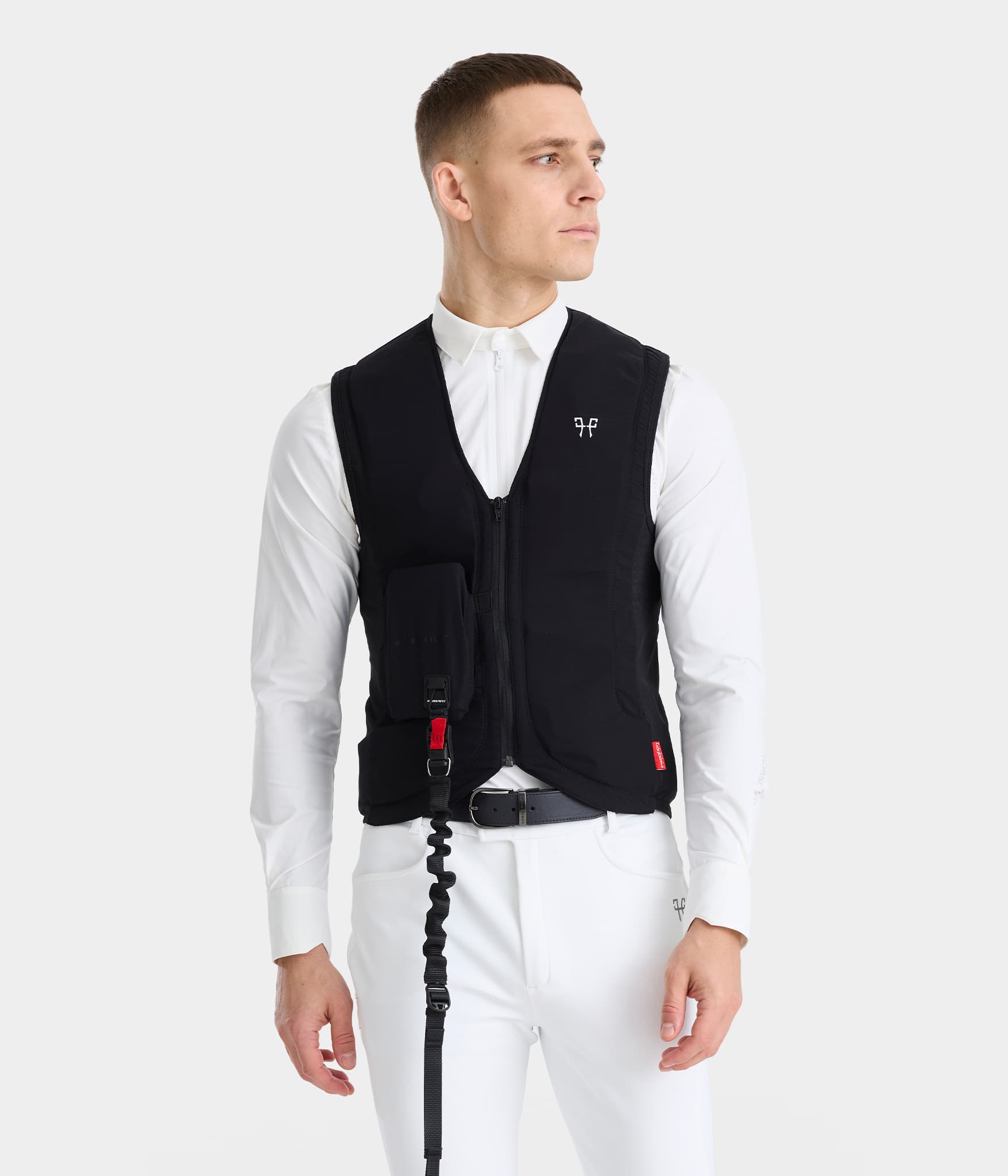 Gracias a su ergonomía y al material bi-stretch del chaleco, puede soportar que el airbag se infle sin perder ligereza. La tela mesh de las costillas y la espalda aporta al jinete la transpirabilidad que necesita en un momento de esfuerzo intenso. El cable que conecta al jinete con la silla está imantado; se conecta y desconecta con una sola mano, para que el jinete no tenga que soltar las riendas.